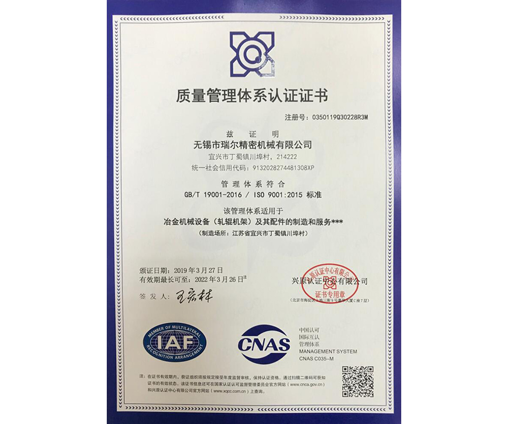 Quality management system certificate
