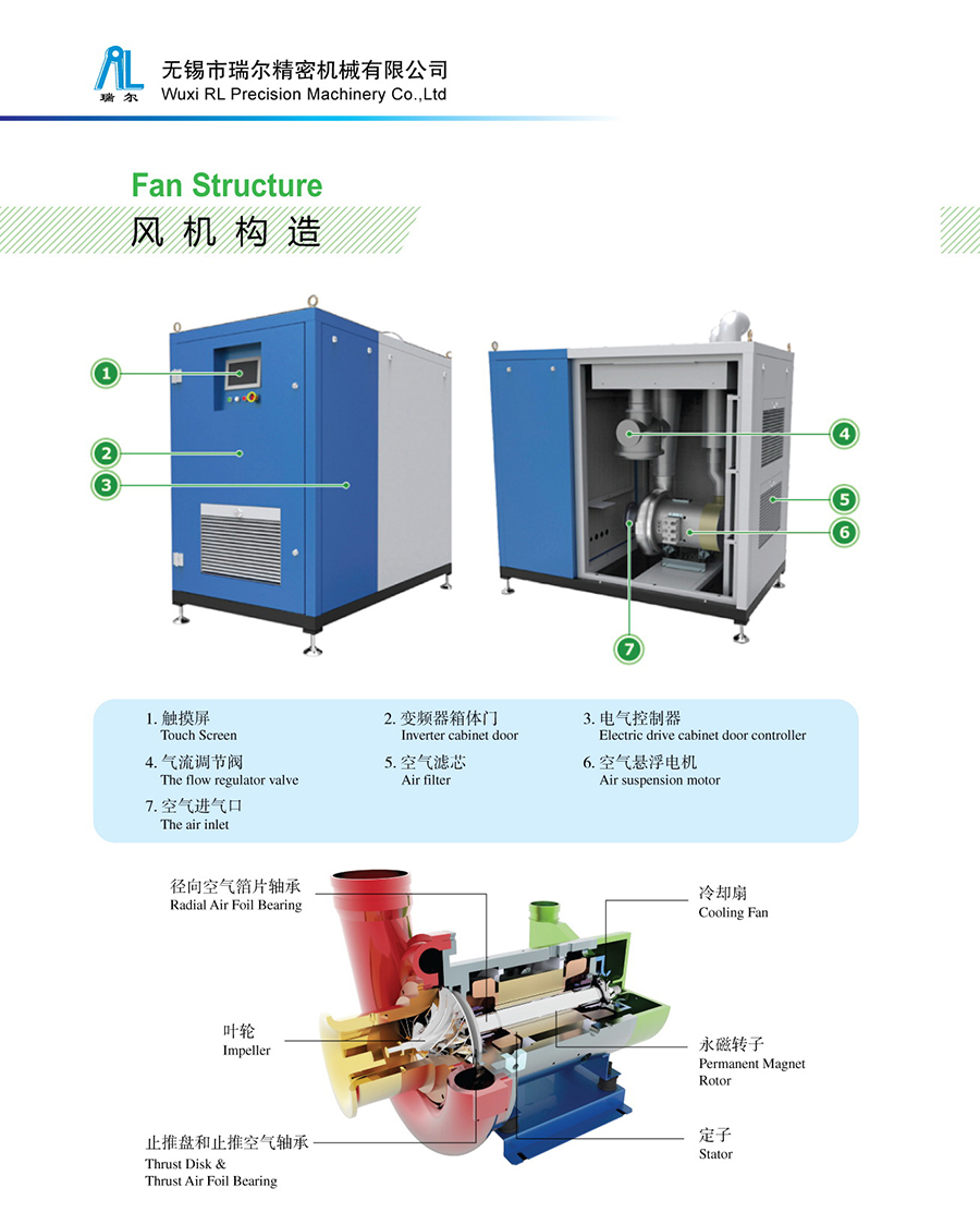 無錫市瑞爾精密機械有限公司從韓國KTurbo公司引進的產品——空氣懸浮軸承高速離心風機。該產品采用空氣懸浮軸承技術,無接觸摩擦,無需潤滑油,無需維護,低噪音,長壽命;配合高速永磁電機,可調式變頻器及鑄造的葉輪,產品性能可達壓縮機等級ISO 8573-1 Class 0,是節能型無油空壓機。